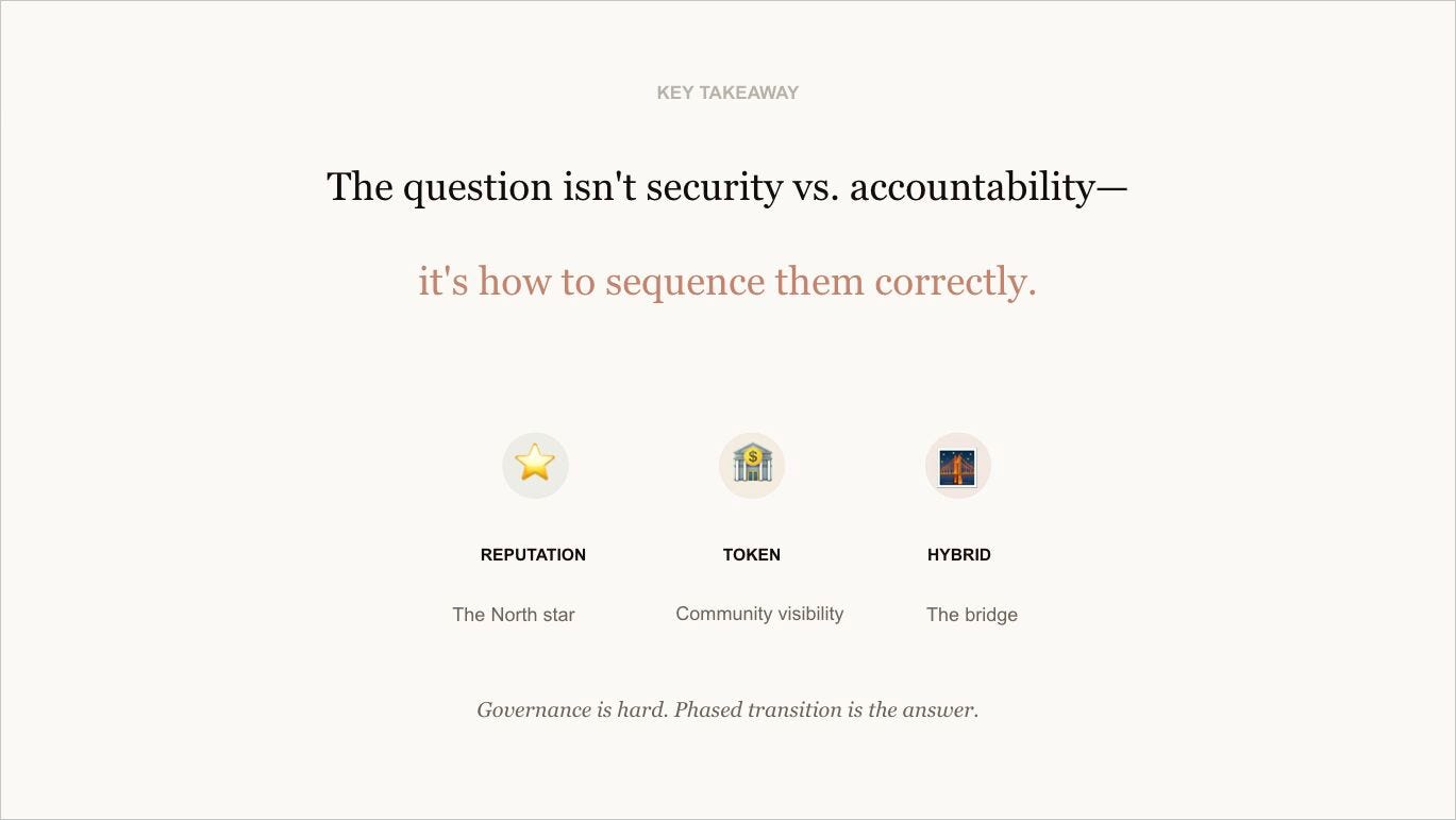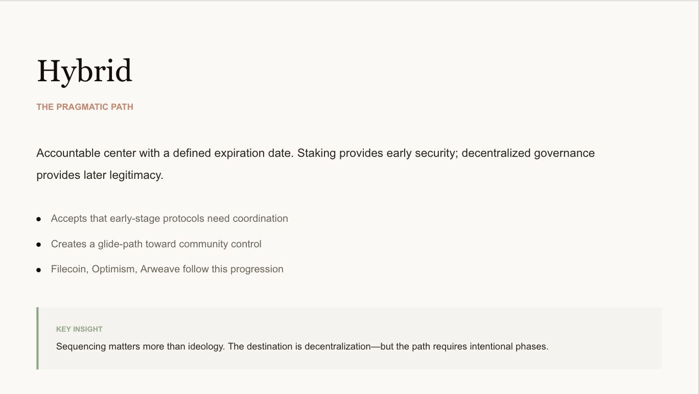 The hybrid model offers a pragmatic glide-path from the economic guarantees of staking toward the institutional maturity that real decentralization requires. The test for any protocol is whether it can execute this transition: from foundation oversight to community control, without falling into plutocracy or paralysis.