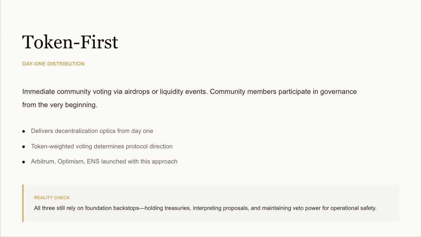 Token-first DAOs distribute decision-making immediately, typically via airdrops or liquidity events. Community members vote from day one. This approach delivers on decentralization optics but consistently requires backstops to remain operationally sound.