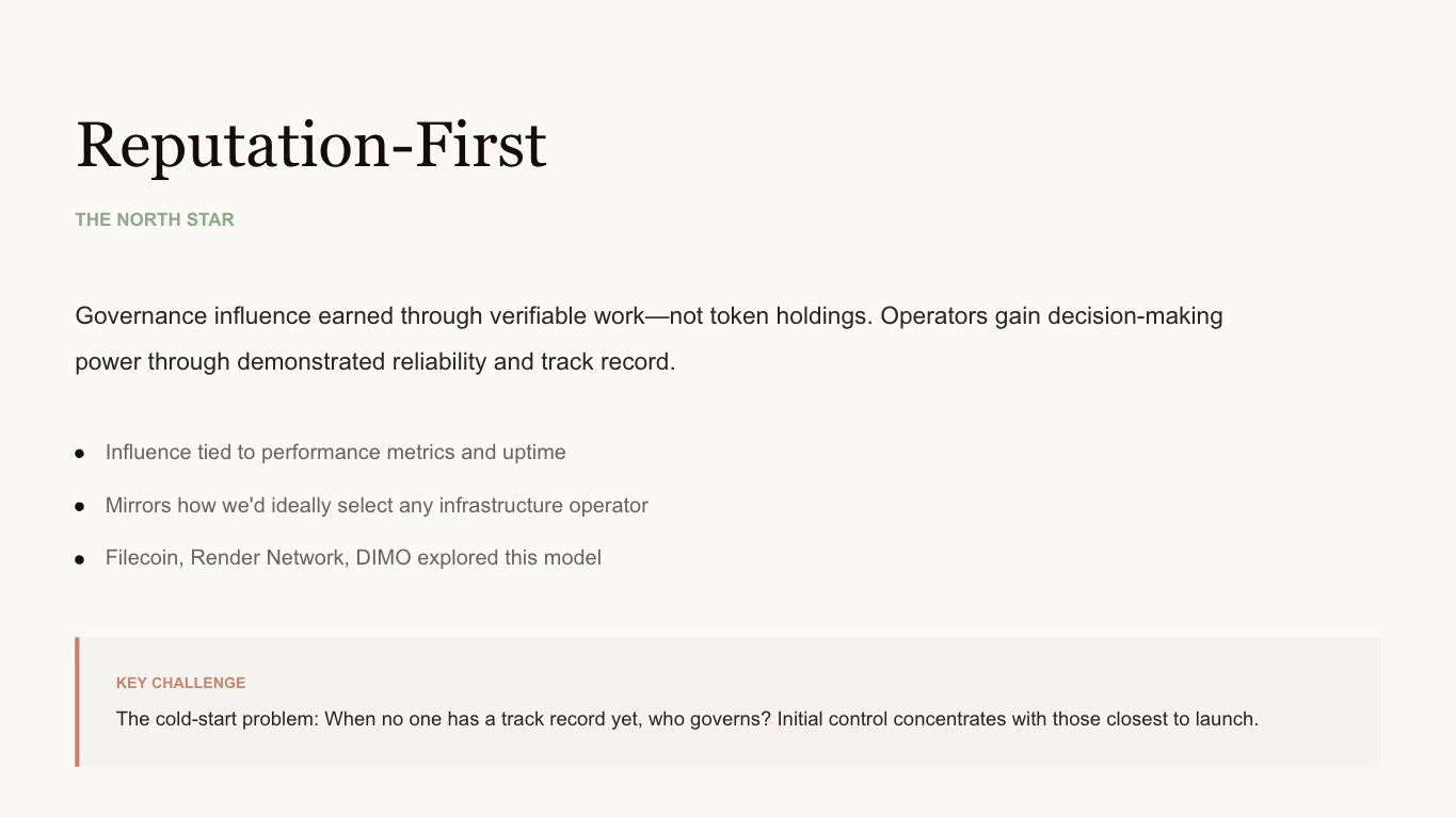The most principled approach to DePIN governance is reputation-first: participants earn governance influence through verifiable work rather than token holdings. Operators who demonstrate reliability, uptime, and quality service gain decision-making power. This mirrors how we would ideally select any infrastructure operator: based on track record, not wealth.