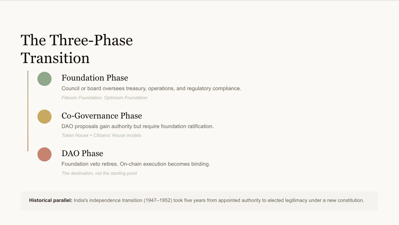 Co-Governance Phase: DAO proposals gain authority but require foundation ratification for execution.